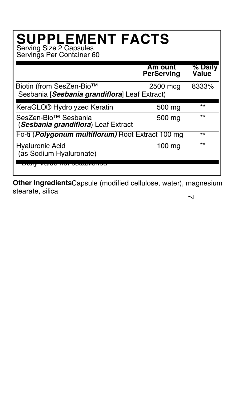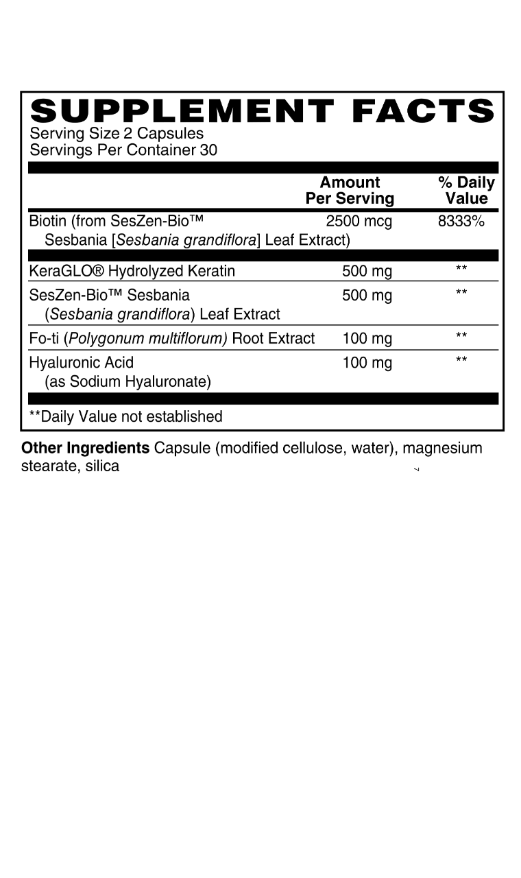 - 500 mg KeraGLO® Hydrolyzed Keratin [92% free amino; 8% dipeptides and tripeptides]