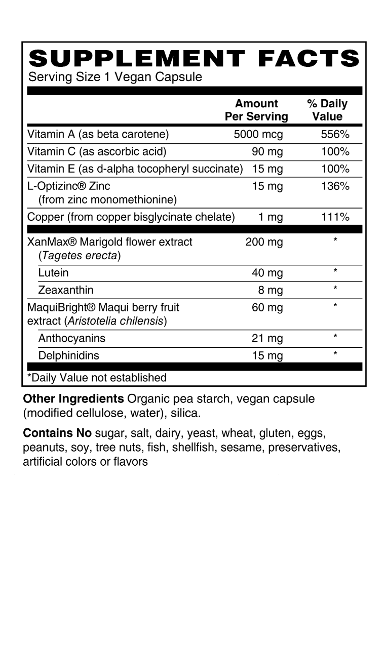 XanMax® supports eye health, healthy vision, night vision, contrast sensitivity, focus, fatigue, improved visual performance with prolonged screen time and provides antioxidant protection. †