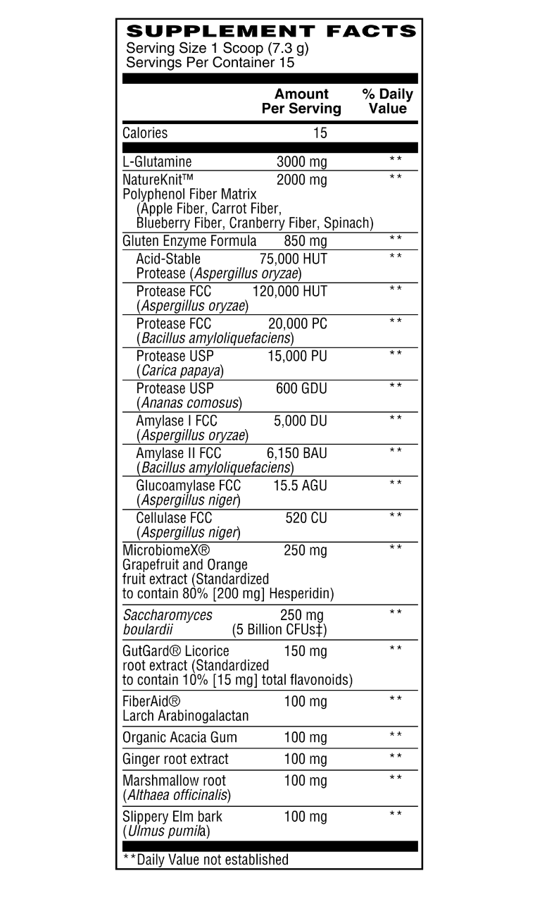 Glutamine directly supports gut health 3 ways: it aids the balance of the gut microbiome, increases tight junction proteins and the integrity of the intestinal lining, and helps to minimize the inflammatory response in situations of gut mucosal irritation.†