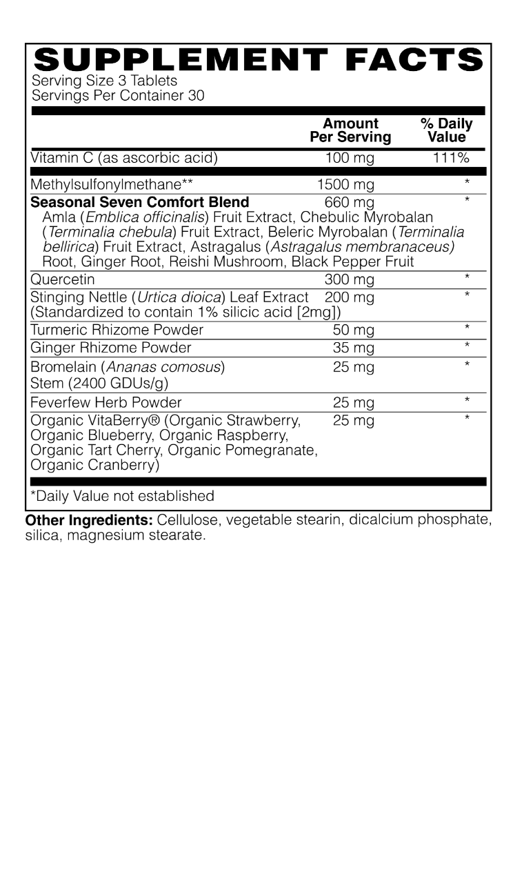 - All Season Support features Stinging Nettle (200mg), Quercetin (300mg), and Bromelain (25mg).