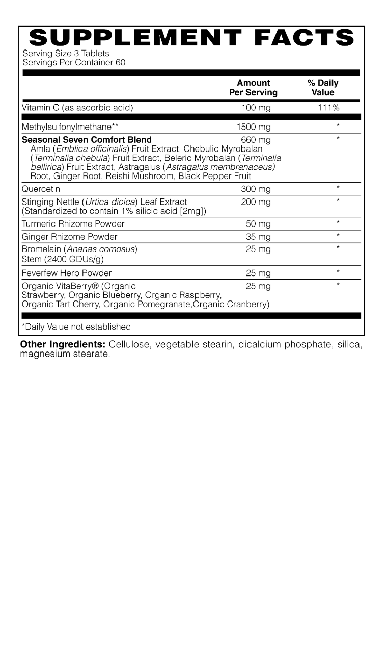 - All Season Support has Seasonal Seven Comfort Blend (660mg)*, a proprietary blend of Amla (Emblica officinalis) Fruit Extract, Chebulic Myrobalan (Terminalia chebula) Fruit Extract, Beleric Myrobalan (Terminalia bellirica) Fruit Extract, Astragalus (Astragalus membranaceus) Root, Ginger Root, Reishi Mushroom, and Black Pepper Fruit.