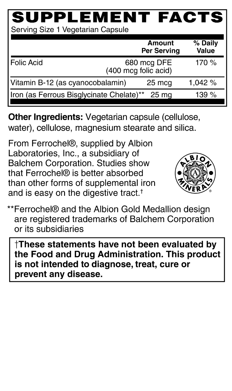 Iron is a very important nutrient, yet studies show that iron deficiency continues to be one of the most common nutrient deficiencies worldwide. Iron is essential for the synthesis of healthy red blood cells.† It is also involved in energy production and immune function.† The problem with many iron supplements on the market is that they often cause stomach upset, constipation and sometimes nausea. We use the patented Ferrochel® form of iron. This form of iron is gentle on the stomach, and has been shown to be better absorbed than other forms of iron. Ferrochel® has been shown in studies to increase and maintain blood levels of iron.† Vitamin B-12 and folic acid are included for additional support in building healthy red blood cells.†