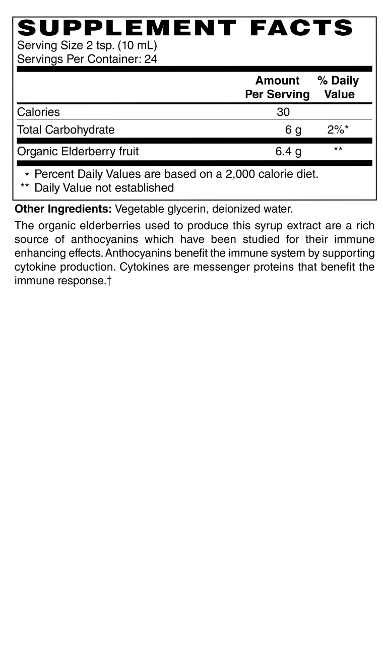 - Provides 6,400 mg of certified organic elderberry fruit extract per serving.