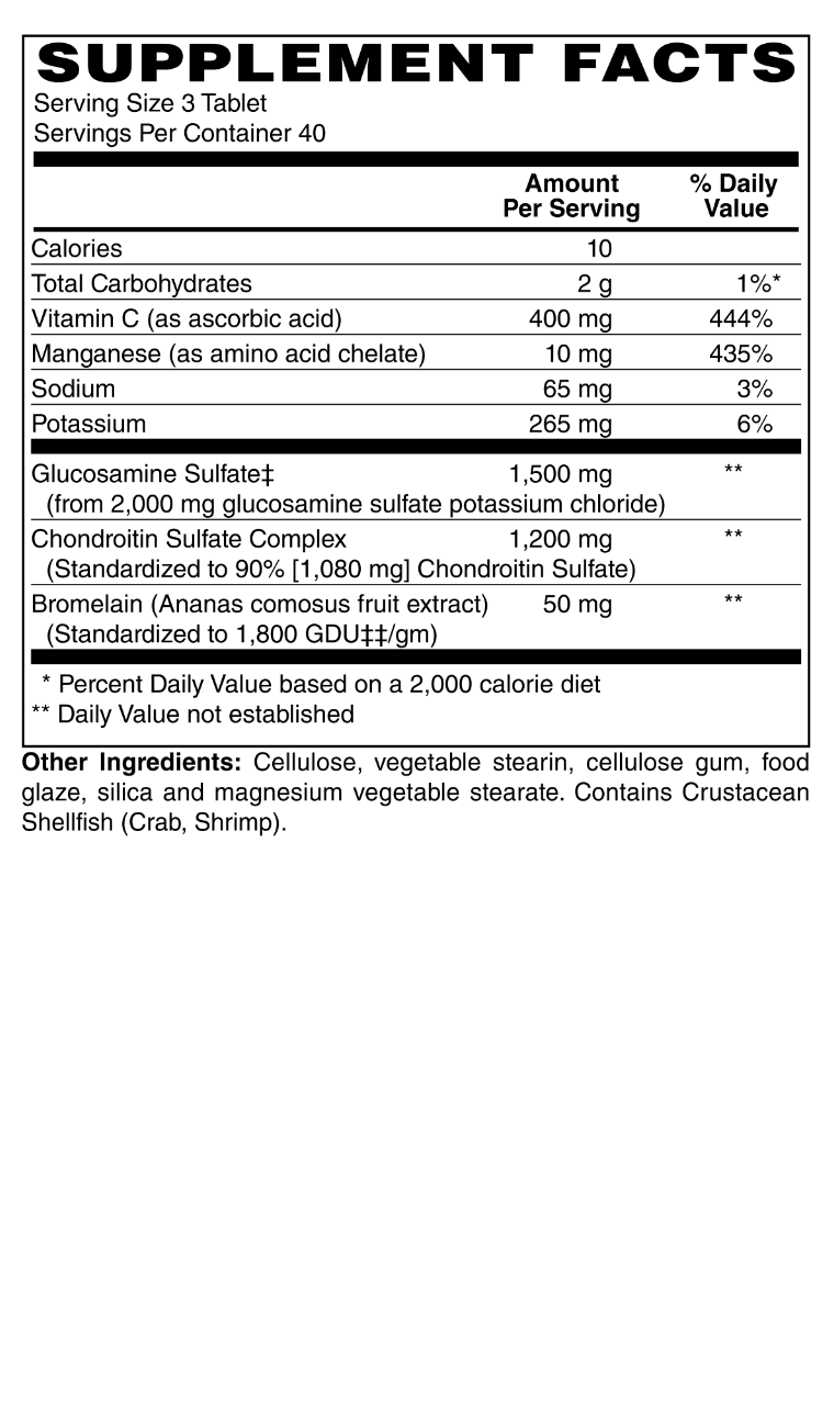Joint disease is a potentially debilitating condition that affects the soft tissue matrix that “cushions” our joints. Glucosamine and chondroitin sulfate are both integral components of healthy joint tissue and are the forms that have been used in major clinical trials. Vitamin C, manganese, and bromelain work synergistically to enhance the proven benefits of these components.