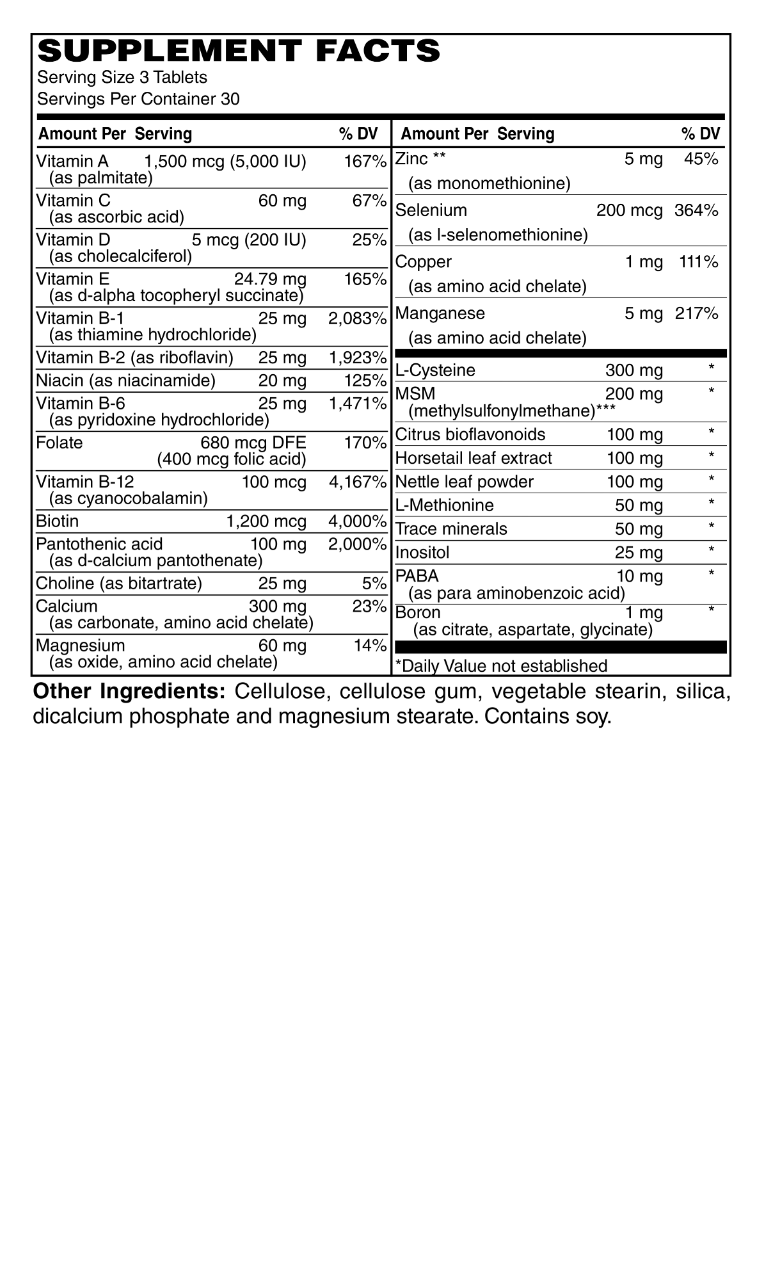This nutrient-rich formula combines biotin, MSM, silica-rich horsetail extract, and L-cysteine with a full spectrum of essential vitamins and trace minerals to help your body maintain healthy connective tissue and promote cellular renewal.