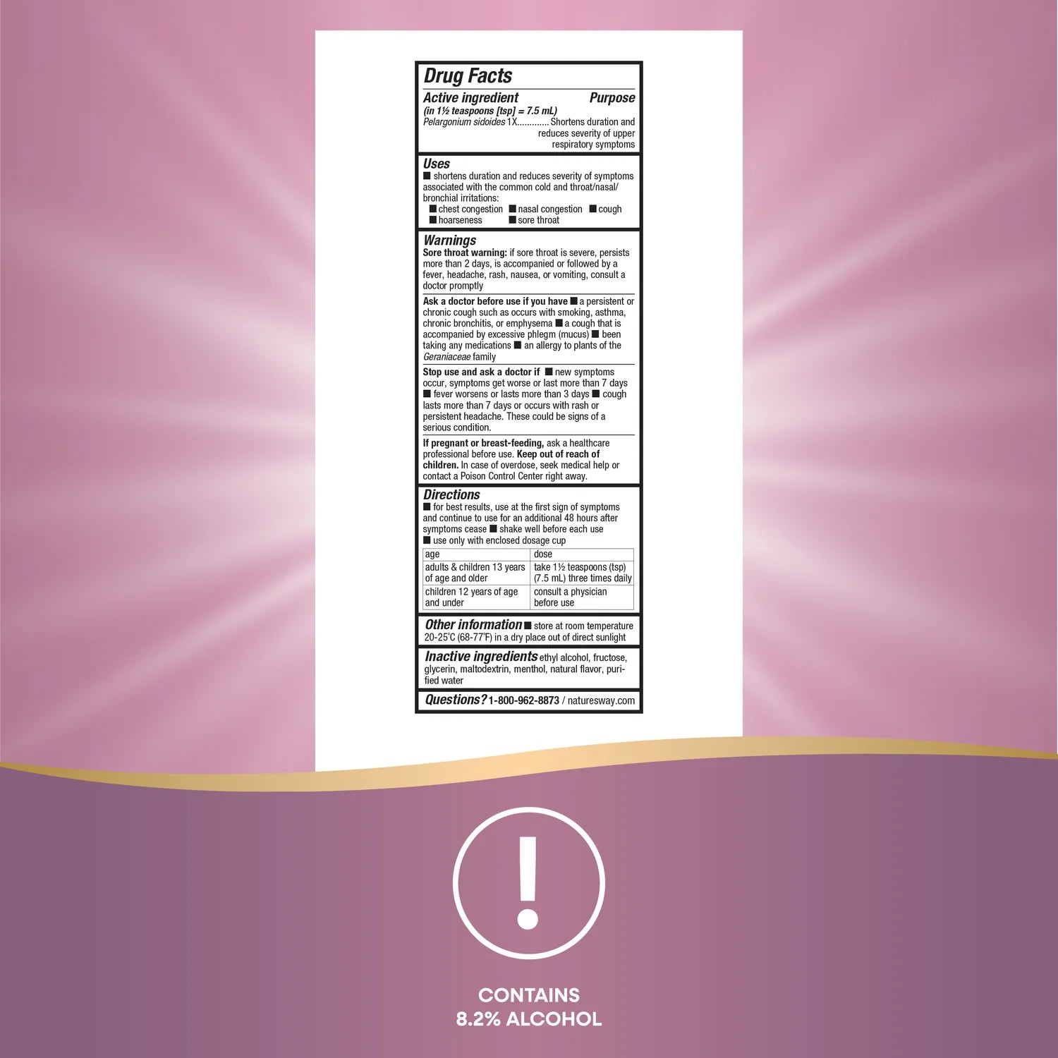 Nature's Way Umcka Cold Relief Syrup contains the clinically proven homeopathic active ingredient Pelargonium sidoides 1X to shorten colds and reduce severity of cough, congestion, sore throat, and stuffy nose. It does more than just reduce symptoms — it speeds recovery to help you feel better faster.