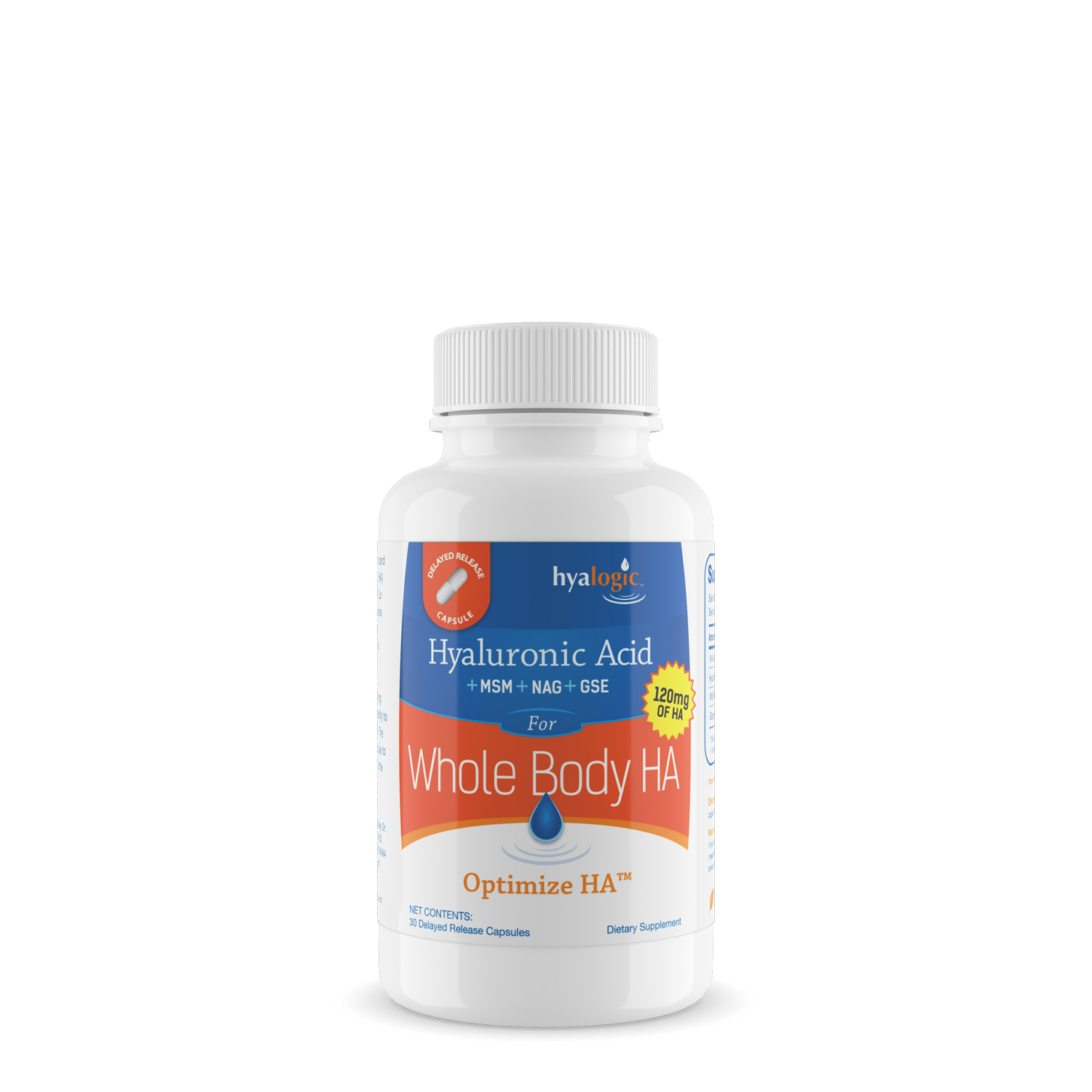 Our vegan-friendly, gluten-free delayed-release Optimize HA capsules contains MSM, NAG and Grape Seed Extract known individually to help maintain proper HA levels throughout the body. 120 mg of Hyaluronic Acid per amount.