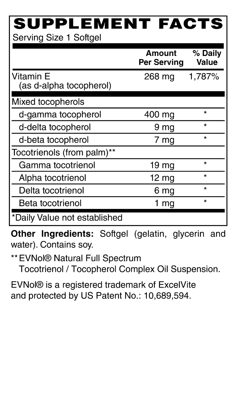 - Tocotrienols from Patented Evnol® brand tocotrienols is a true full-spectrum palm tocotrienol complex with the highest ratio of alpha-, beta-, gamma, and delta-tocotrienols; guaranteed non-GMO!