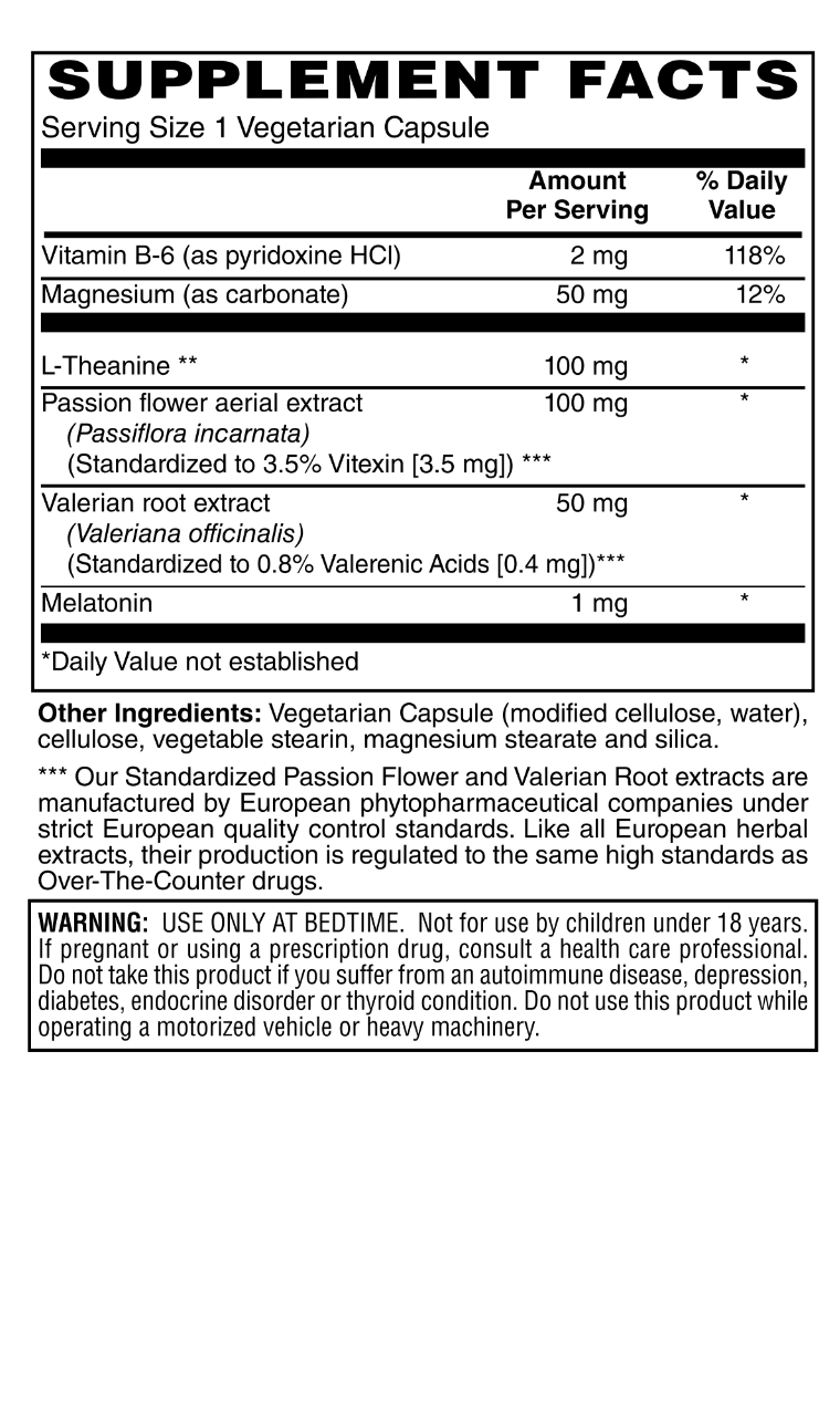 - Contains L-Theanine (AlphaWave®), Melatonin, Passion Flower and ValerianRoot