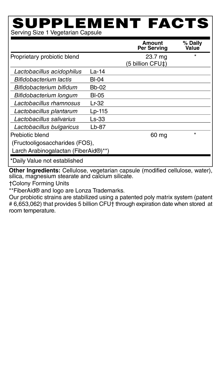 - The prebiotic blend consists of FOS (food source for probiotics), and FiberAid® arabinogalactans (patented prebiotic from Lonza®) to help support the growth of probiotics.