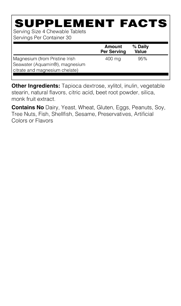 - 400 mg Magnesium per serving, 100mg of Magnesium per Chewable tablet (from Aquamin®, magnesium citrate and magnesium chelate)